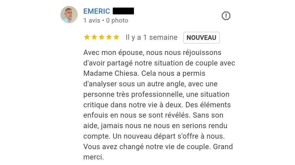 En faisant face aux problèmes de manière proactive et en envisageant la thérapie de couple telle que je la propose, vous pouvez renforcer votre amour et reconstruire une relation plus harmonieuse et épanouissante. Pour cela, il est important d’accepter l’aide d’un thérapeute de couple expérimenté. En effet, vouloir s’en sortir seul est illusoire : vous allez retomber dans des schémas et pièges que vous ne voyez pas car ils vous ont conduit à la situation actuelle.